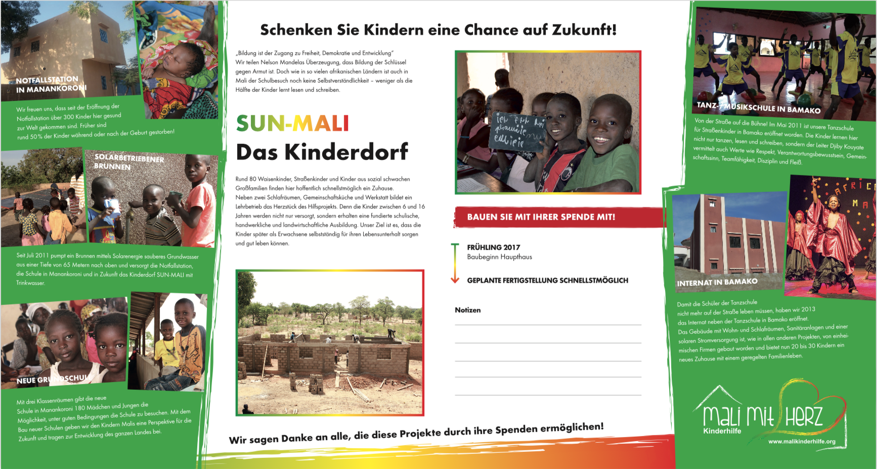 Alle Kinder auf dieser Welt brauchen Liebe, Schutz und eine Lebensperspektive.Jedes Kind hat Träume, das Recht auf Bildung und medizinische Versorgung.Mit Ihrer Hilfe schenken Sie den notleidenden Kindern in Mali ein menschenwürdiges Leben.Herzlichen Dank für Ihre Unterstützung!