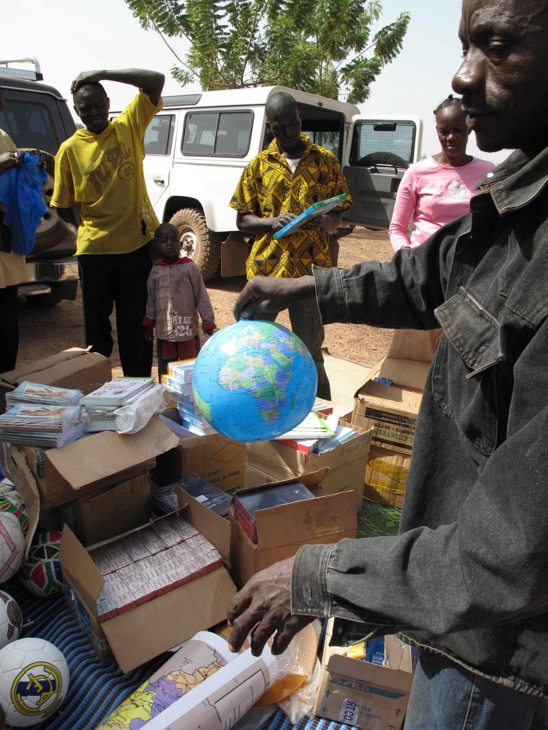 Der Schuldirektor stellt uns eine Liste zusammen. In einer Buchhandlung auf dem Markt in Bamako werden die Lehrmittel, Schreibmaterial, Hefte, usw. eingekauft.